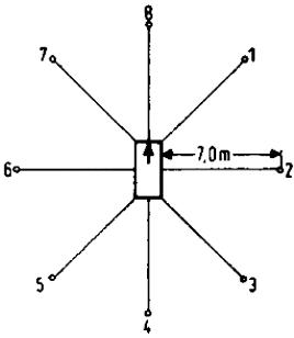 Die Messung erfolgt am stehenden Fahrzeug gemäß Abbildung 2 an acht Messpunkten in 7 m Entfernung vom Fahrzeugumriss und in 1,2 m Höhe.